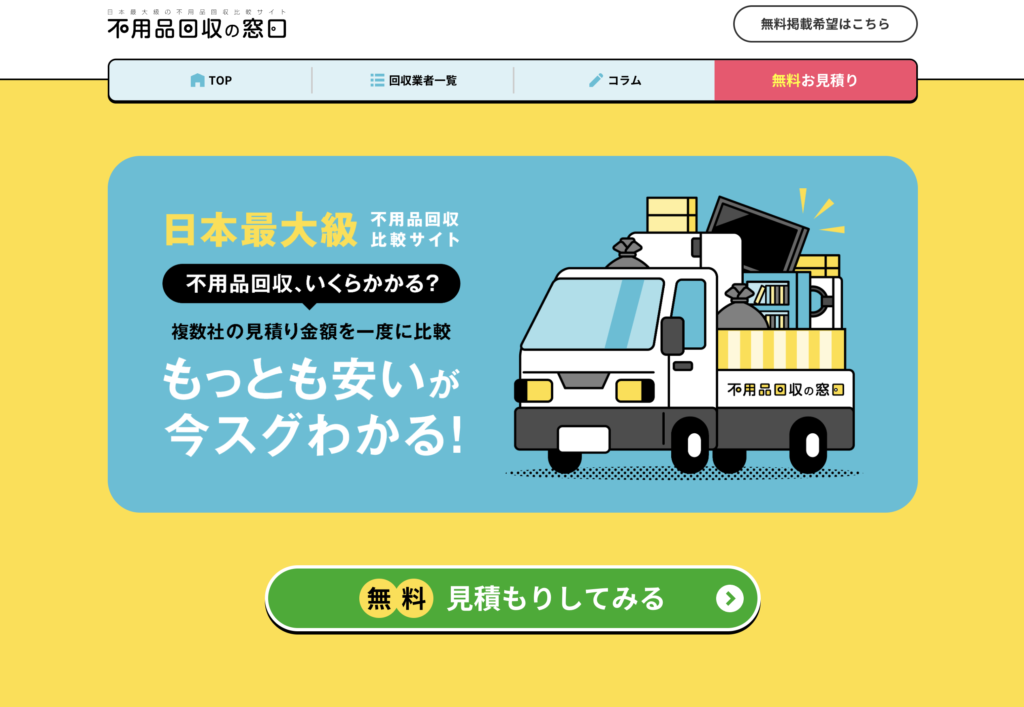 ↓↓【不用品回収の窓口】は、一度に複数の回収業者へ見積もり依頼・比較ができる日本最大級のポータルサイトです↓↓