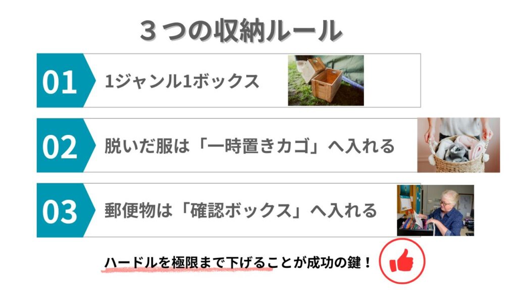 これだけで床やテーブルの上が散らかるのを防げます。ハードルを極限まで下げることが成功の鍵です。