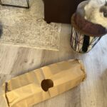 トンネルを設置すると、さっそくラグドールが近寄ってきました。最初にしたのはいつものように匂いチェック。紙の匂いが気になったのか、トンネルの周りをくるくる歩きながら念入りに匂いをかいでいました。