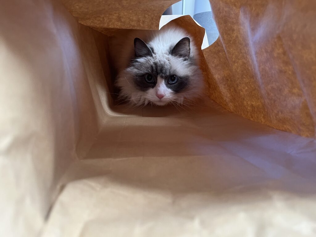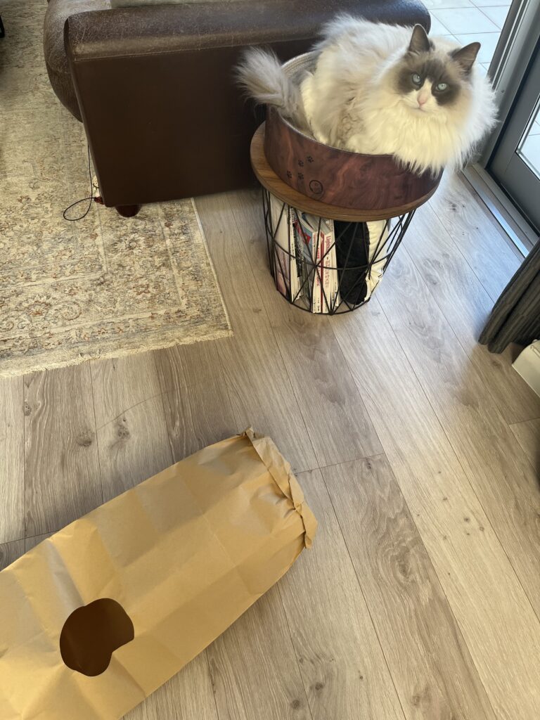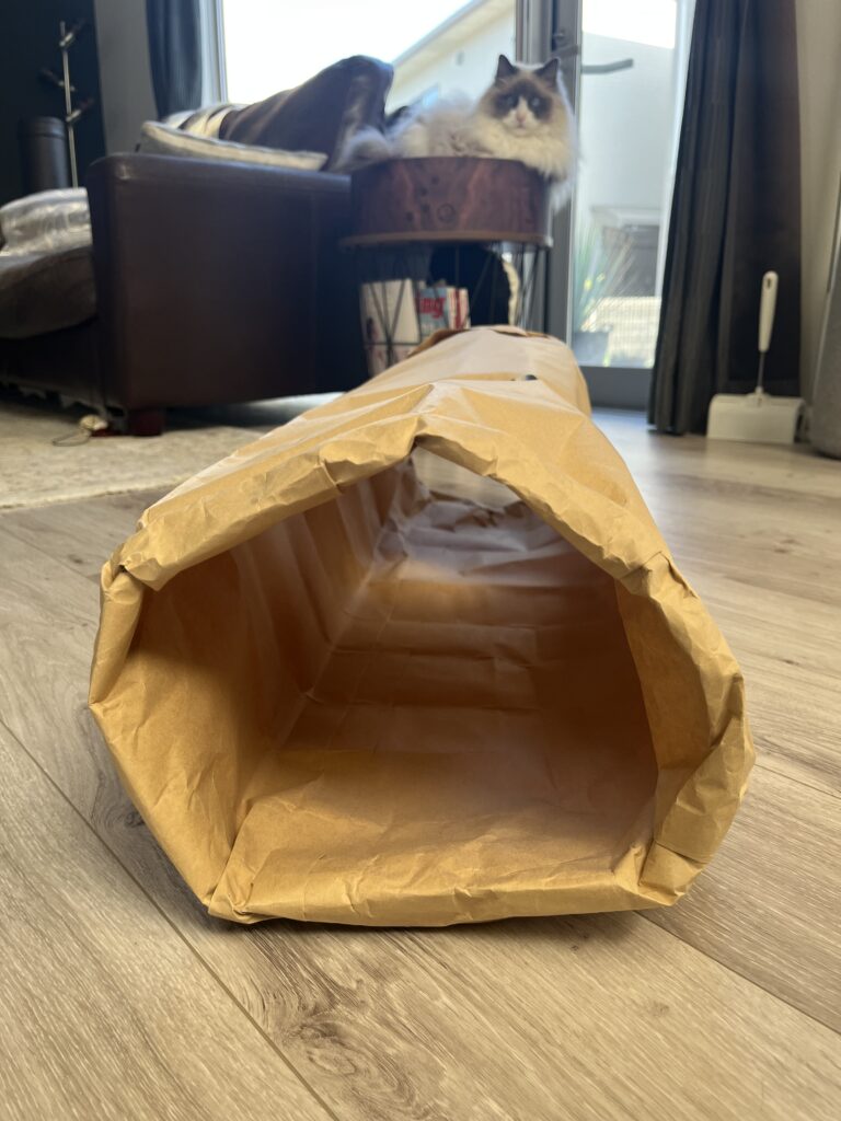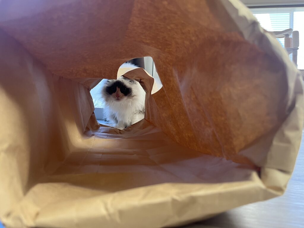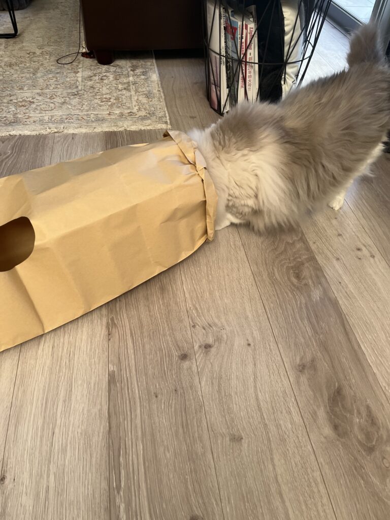 ラグドールには少し小さくて中に入ることはできませんでしたが、おもちゃを使った「手だけ突っ込む遊び」や「覗き込む遊び」はしっかり楽しんでくれました。
